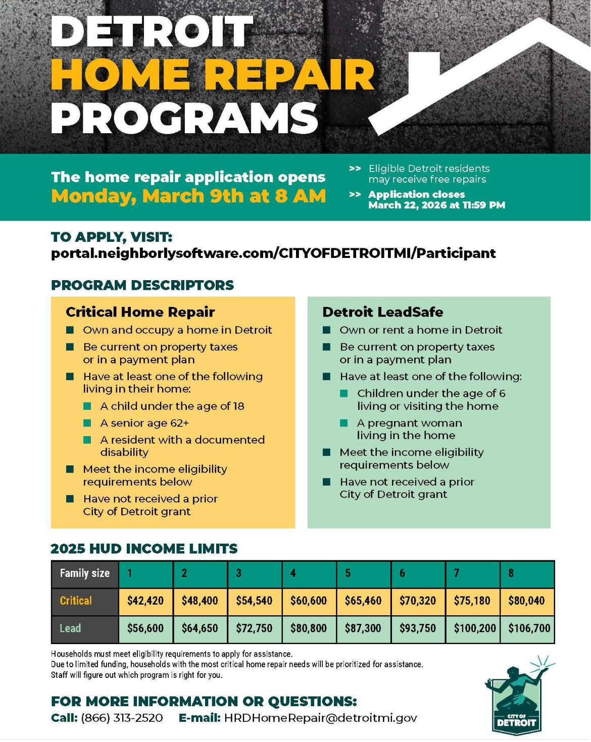 Call (866) 313-2520 or Email HRDHomeRepair@detroitmi.gov