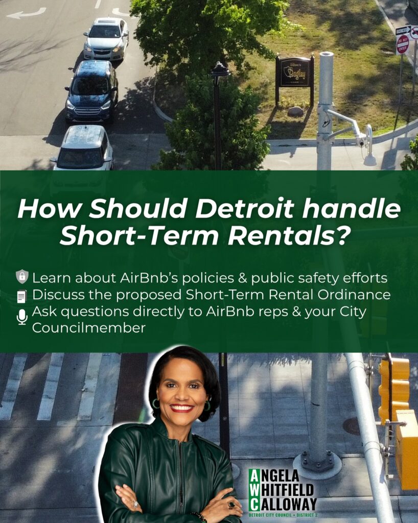 Join Councilmember Angela Whitfield Calloway and representatives from AirBnB to discuss the future of short term rentals in Detroit.